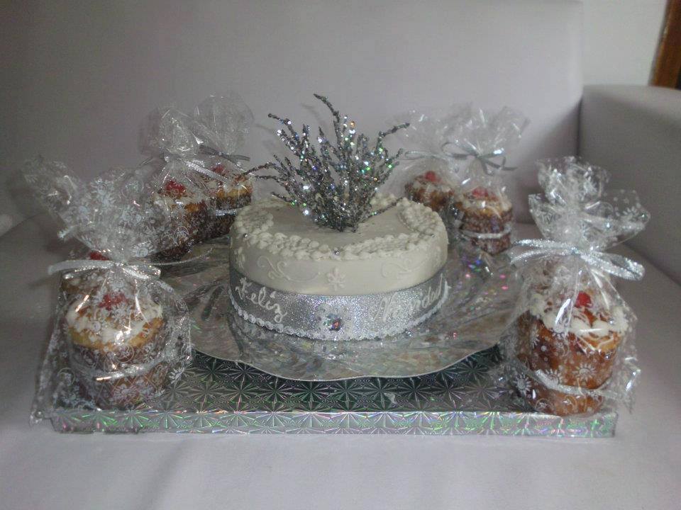 Torta budín inglés especial navideño con nueces y frutas glaseadas, decorado en pasta americana con glasé , 12 porciones, con 6 mini pan dulces decoración especial para regalar, $330.