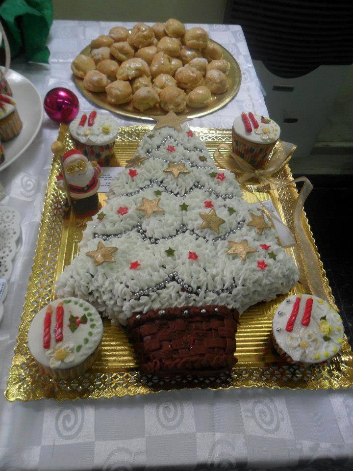 Budín inglés especial o torta galesa para 20 o 25 personas en forma de arbol navideño, revestida en azúcar glasé o pasta americana, con 6 cupcakes decorado especial, $ 400.