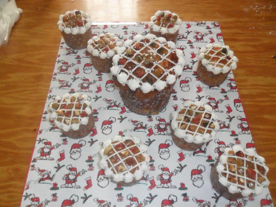Mini pan dulce con frutas glaseadas y frutos secos, decorado en glasé, bolsitas de celofán y moño, para regalar $17 c/u. Mediano 650 gr. aprox. $80.