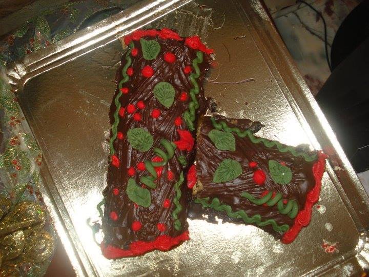 Tronco de chocolate. Pionono embebido en almíbar y oporto, relleno con dulce de leche y ganache de chocolate, bañano en chocolate con detalles en glasé y pasta de goma $180 el Kg.